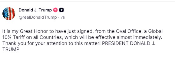 «Ինձ համար մեծ պատիվ է հենց նոր Օվալյան աշխատասենյակից ստորագրել բոլոր երկրների նկատմամբ 10 տոկոս համընդհանուր մաքսատուրք սահմանելու մասին որոշումը, որը կմտնի ուժի մեջ գրեթե անմիջապես։ Շնորհակալ եմ այս հարցի նկատմամբ ձեր ուշադրության համար»,- գրել է Թրամփը։