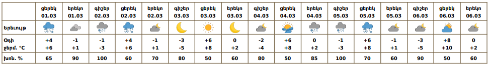 Երևան քաղաքում մարտի 1-ի ցերեկը, 2-ին, 4-ի երեկոյան ժամերին, 5-ին ժամանակ առ ժամանակ սպասվում են տեղումներ․ ձյան և ձնախառն անձրևի տեսքով։ Մարտի 3-ին, 4-ի գիշերը, 6-ին սպասվում է առանց տեղումների եղանակ։