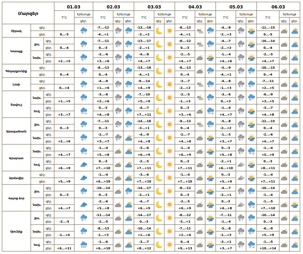 Հանրապետության տարածքում մարտի 1-ի ցերեկը, մարտի 2-ին, 4-ի ցերեկը, 5-ին առանձին շրջաններում սպասվում են տեղումներ․ լեռնային և նախալեռնային շրջաններում ձյան, հովտային շրջաններում ձնախառն անձրևի և անձրևի տեսքով։ Լեռնային շրջաններում սպասվում է նաև բուք, ցածր հորիզոնական տեսանելիություն։ Ավտոճանապարհների առանձին հատվածներում սպասվում է նաև մերկասառույց։
