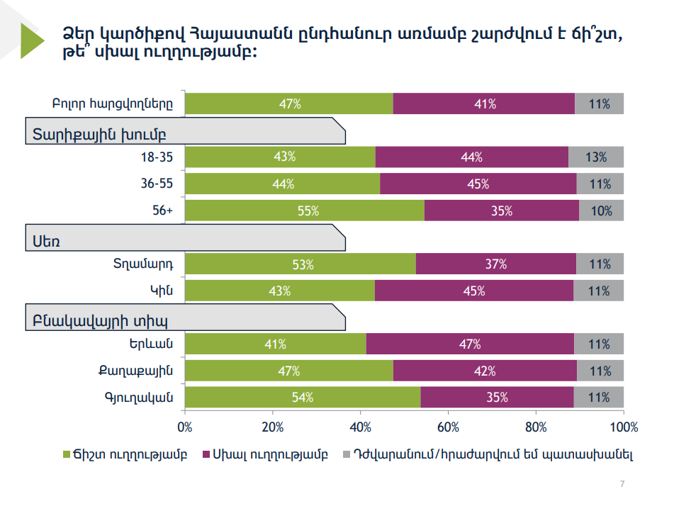 Հարցված երևանաբնակների գրեթե կեսը (47%)՝ նշել է «սխալ ուղղությամբ» տարբերակը։ Գյուղական վայրերում պատկերը ճիշտ հակառակն է՝ հարցվածների մեծամասնությունը՝ 54%-ը, երկրի ընթացքը համարում է ճիշտ։