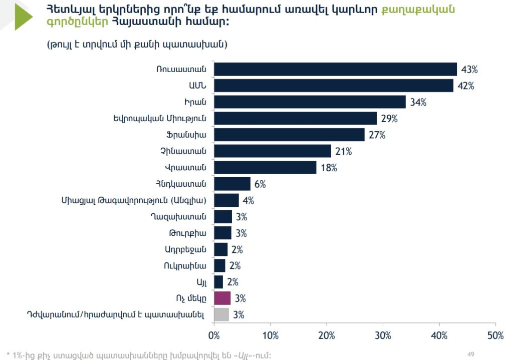 Հարևան Իրանը 34 տոկոսով երրորդ տեղում է, 29 տոկոս գրանցվել է Եվրոպական միության տարբերակի օգտին, հետո Ֆրանսիան է՝ 27 տոկոսով, Չինաստանը՝ 21, Վրաստանը՝ 18, հաջորդում են Հնդկաստանը, Միացյալ Թագավորությունը, Ղազախստանը։ Ուշագրավ է, որ հարցվողների մի մասը կարևոր քաղաքական գործընկեր են համարում նաև Թուրքիան (3 տոկոս) և Ադրբեջանը (2 տոկոս)։