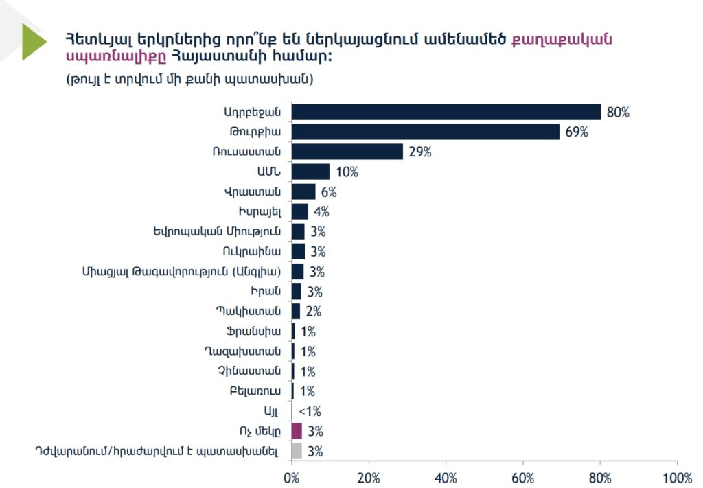 Ո՞ր երկրներն են մեծագույն սպառնալիք ներկայացնում ՀՀ-ի համար․ այս հարցի պատասխանի արդյունքում այսպիսի պատկեր է․ հարցվածների 80 տոկոսը նշել է Ադրբեջանը, 69 տոկոսը՝ Թուրքիան, Ռուսաստանը 29 տոկոսով երրորդ տեղում է։ ԱՄՆ-ն մեծագույն սպառնալիք է հարցվողների 10 տոկոսի, Վրաստանը՝ 6, Իսրայելը՝ 4 տոկոսի համար։