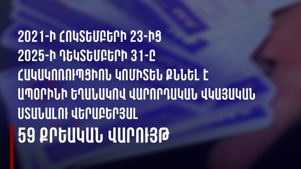 «Կոմիտեում առկա վիճակագրական տվյալների համաձայն՝ կոմիտեի կազմավորման օրվանից՝ 2021 թվականի հոկտեմբերի 23-ից 2025 թվականի դեկտեմբերի 31-ն ընկած ժամանակահատվածում ապօրինի եղանակով վարորդական վկայական ստանալու դեպքերի առթիվ Կոմիտեում քննվել է 59 քրեական վարույթ»։
