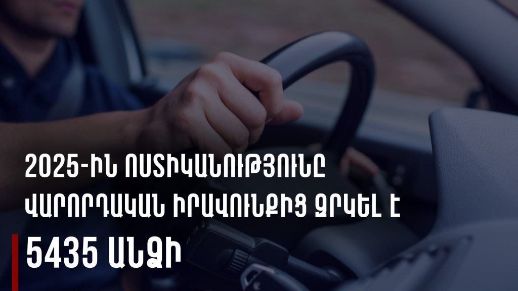 ՆԳՆ Ոստիկանությունից ստացված տեղեկությունների համաձայն՝ 2025-ի ընթացքում ընդհանուր առմամբ Ոստիկանության կողմից վարորդական իրավունքից զրկման դեպքերը 5435 են, մինչդեռ ճանապարհային ոստիկանության 3 տարվա միջին տարեկան արդյունքը մինչ այդ եղել է 764 դեպք։