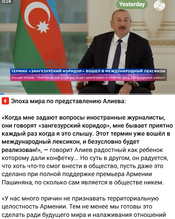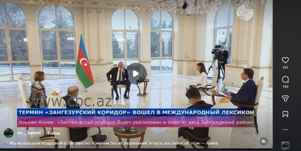 Ինչ վերաբերում է Ալիևի մասնակցությամբ տարածվող տեսանյութին, այն վերցված է 2022 թ. հունվարի 12-ին Ադրբեջանի ղեկավարի 2 ժամանոց հարցազրույցից։ Այնտեղ լրագրողն Ալիևին հարցնում է, թե որ փուլում է ցամաքային ճանապարհով «Զանգեզուրի միջանցքի» բացումը։ Ալիևը պատասխանում է․