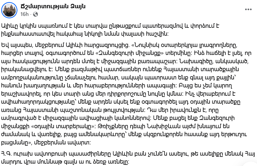 «Զանգեզուրի միջանցքի» օդային տարածքով թռիչքների մասին Ալիևի խոսքերը նոր չեն․ ո՞րն է կոնտեքստը