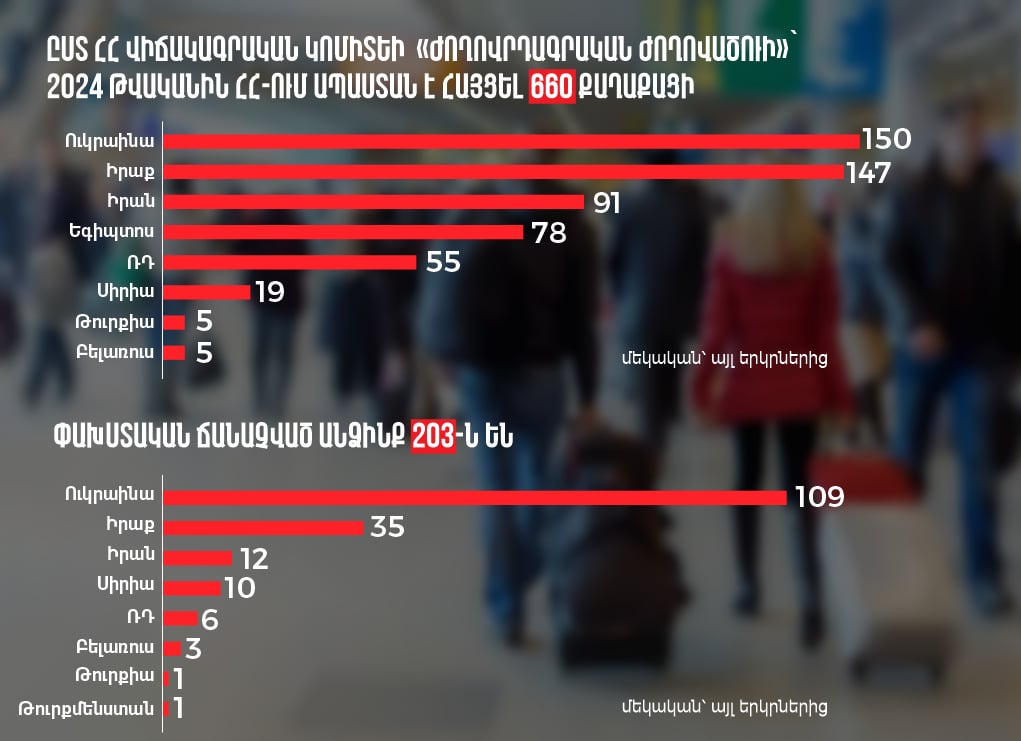 Ըստ ՀՀ վիճակագրական կոմիտեի ժողովրդագրական ժողովածուի՝ 2024 թվականին ՀՀ-ում ապաստան է հայցել 660 քաղաքացի: