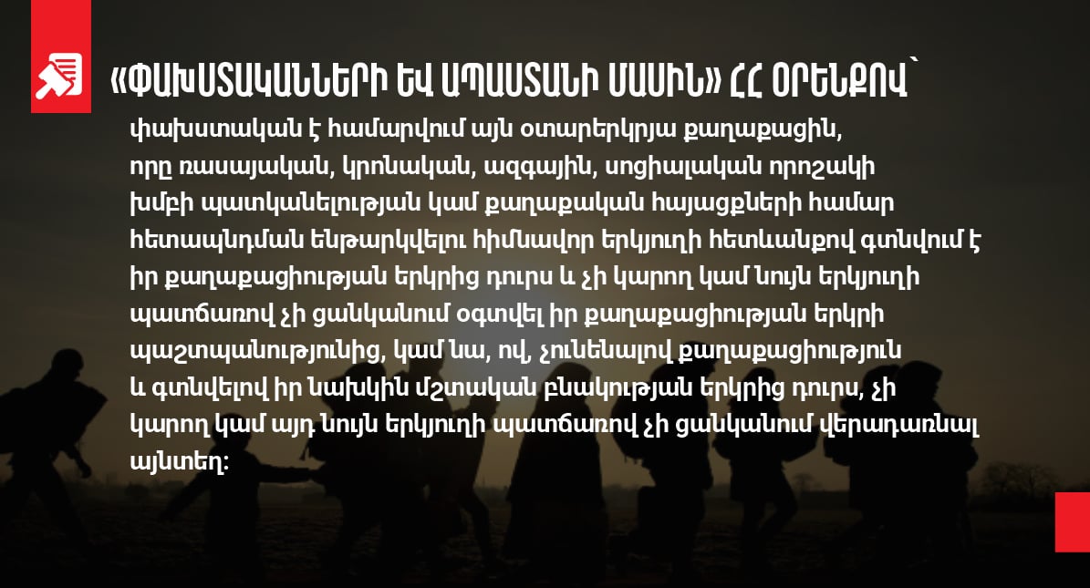 «Փախստականների և ապաստանի մասին» ՀՀ օրենքով՝ փախստական է համարվում` այն օտարերկրյա քաղաքացին, ով ռասսայական, կրոնական, ազգային, սոցիալական որոշակի խմբի պատկանելության կամ քաղաքական հայացքների համար հետապնդման ենթարկվելու հիմնավոր երկյուղի հետևանքով գտնվում է իր քաղաքացիության երկրից դուրս և չի կարող կամ նույն երկյուղի պատճառով չի ցանկանում օգտվել իր քաղաքացիության երկրի պաշտպանությունից, կամ նա, ով, չունենալով քաղաքացիություն և գտնվելով իր նախկին մշտական բնակության երկրից դուրս, չի կարող կամ այդ նույն երկյուղի պատճառով չի ցանկանում վերադառնալ այնտեղ: