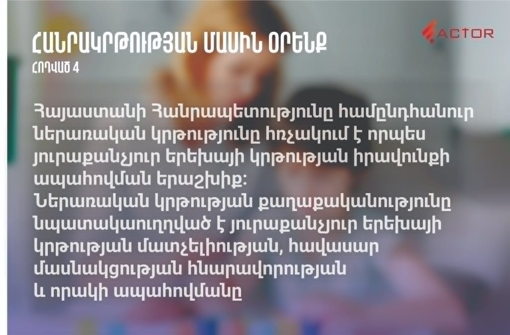2014 թ․-ի դեկտեմբերի 1-ին, ԱԺ-ն փոփոխություններ ու լրացումներ կատարեց «Հանրակրթության մասին» օրենքում: Ըստ այդմ՝ մինչև 2025 թ.-ի օգոստոսի 1-ը երկրում պետք է ներդրվեր համընդհանուր ներառական կրթության համակարգ: