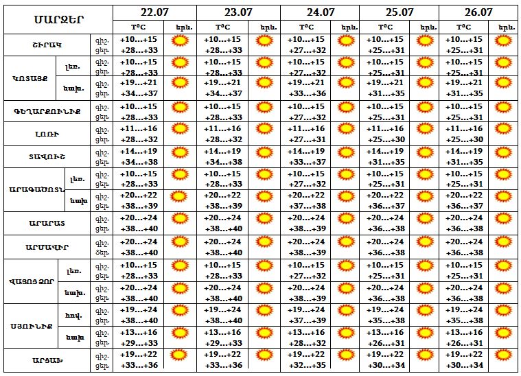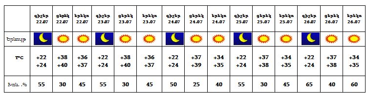 Հուլիսի 22-26-ը հանրապետությունում սպասվում է բարձր ջերմային ֆոն, Երևանում, Արարատյան դաշտում և Սյունիքի հովիտներում ցերեկը կանխատեսվում է մինչև 38…40 աստիճան տաքություն և բարձր կարգի հրդեհավտանգ իրավիճակ: