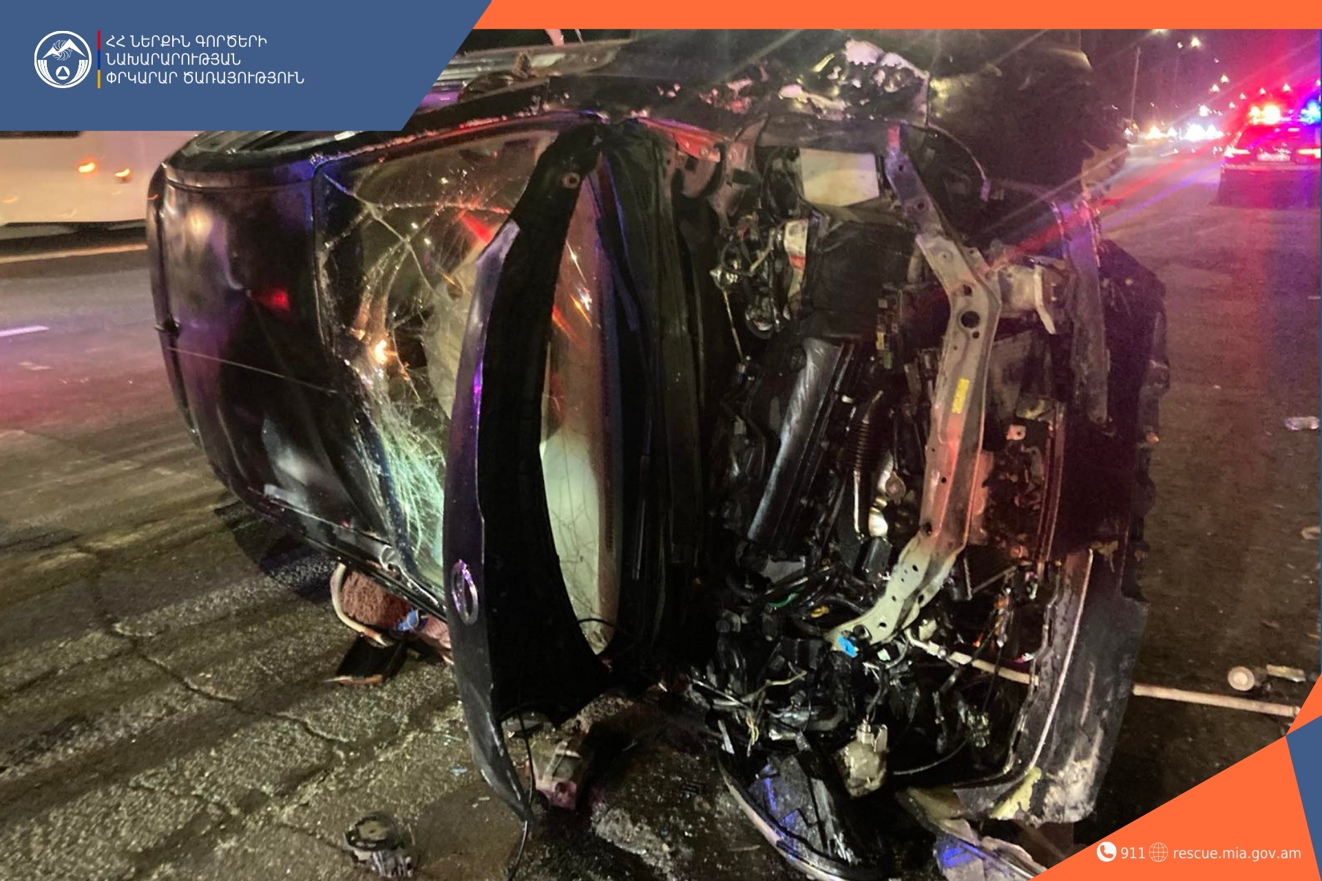 Ավտոմեքենան բախվել է ճանապարհի բաժանարար բետոնե պատնեշին և կողաշրջվել. վարորդը և ուղևորը հոսպիտալացվել են