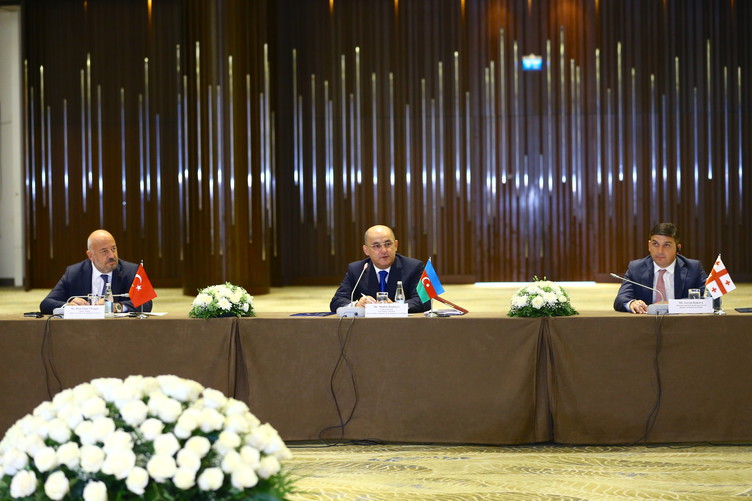 Bakü’de Türkiye, Azerbaycan ve Gürcistan Hükümetleri Arasında Gümrük Konularına İlişkin Üçlü Komite toplantısı yapıldı. Toplantıya Azerbaycan Devlet Gümrük Komitesi Başkan Vekili Şahin Bağırov (ortada), Türkiye Cumhuriyeti Ticaret Bakan Yardımcısı Rıza Tuna Turagay (solda) ve Gürcistan Gelirler Hizmeti Direktörü Levan Kakava (sağda) başkanlığındaki heyetler katıldı. Toplantıda Türkiye, Azerbaycan ve Gürcistan arasında Bakü-Tiflis-Kars demiryolu projesi çerçevesinde transit gümrük işlemlerinin kolaylaştırılması için bilgi değişimine ilişkin anlaşma imzalandı. ( Resul Rehimov – Anadolu Ajansı )
