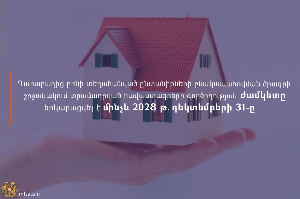 ԼՂ-ից բռնի տեղահանված ընտանիքների բնակապահովման ծրագրի շրջանակում տրամադրված հավաստագրերի գործողության ժամկետը երկարացվել է մինչև 2028 թ. դեկտեմբերի 31-ը․ ԱՍՀՆ