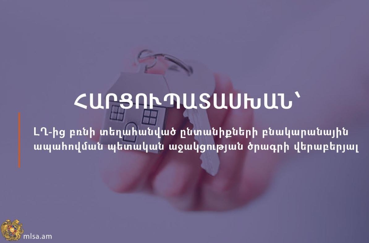 ԱՍՀ նախարարության հարցուպատասխանը՝ ԼՂ-ից բռնի տեղահանված ընտանիքների բնակարանային ապահովման պետական աջակցության ծրագրի վերաբերյալ