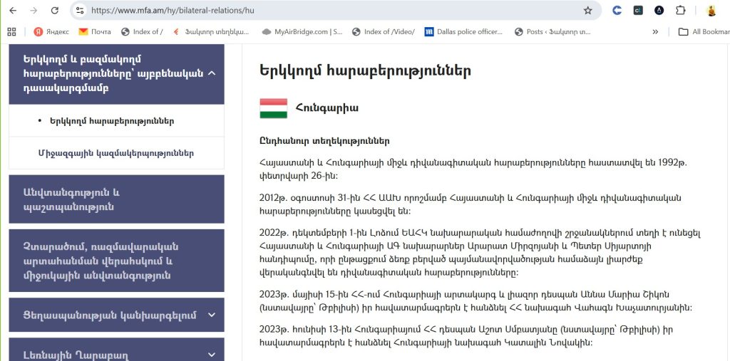 Factor.am-ը գրավոր հարցմամբ դիմել է ՀՀ ԱԳՆ-ին և խնդրել պարզաբանել՝ արդյոք ՀՀ ԱԳՆ կայքի «Երկկողմ հարաբերություններ» բաժնում Հունգարիայի էջում խմբագրումներ կատարվե՞լ են, թե՞ ոչ։